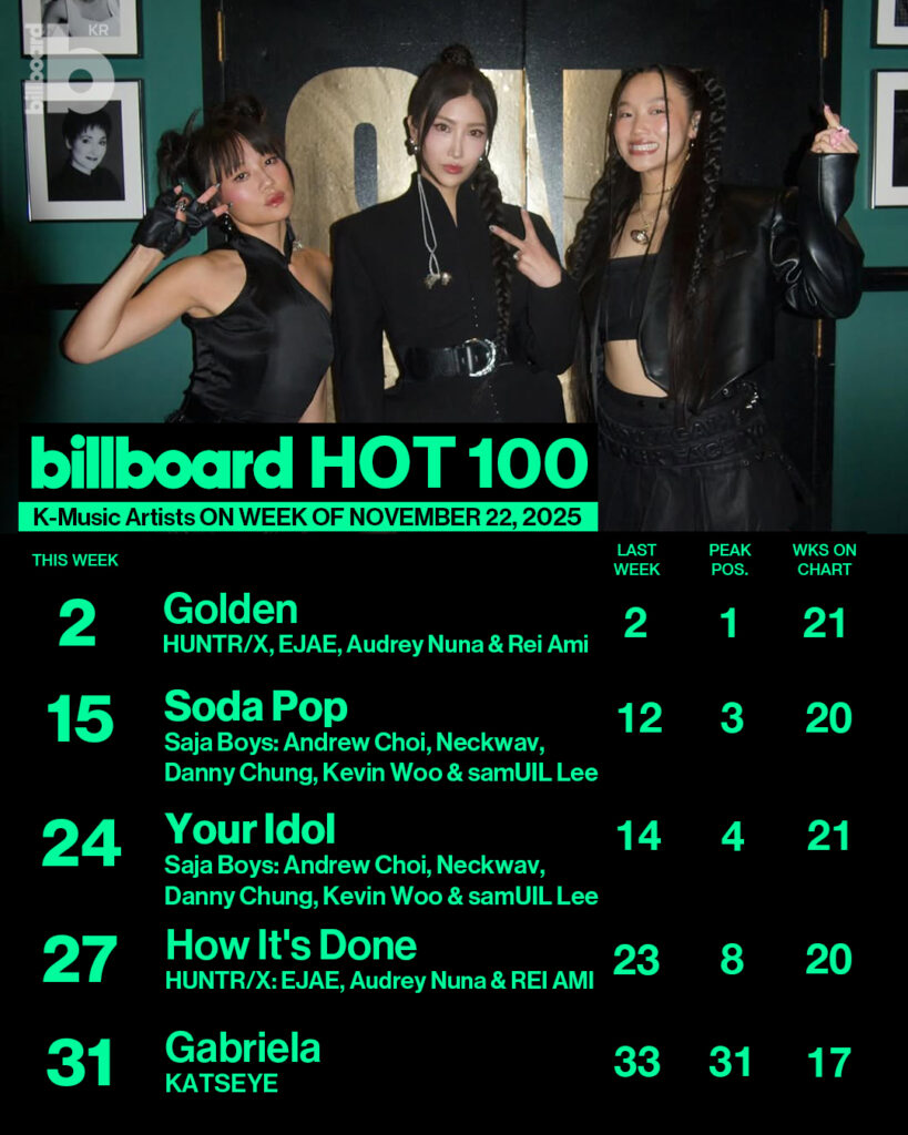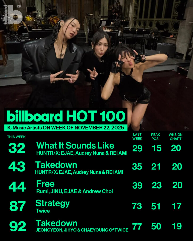 연말이 다가오면서 HOT 100 차트에 윈터송들이 속속 등장하는 중! 올해도 머라이어 캐리의 "All I want for Christmas is you"도 11위를 기록하며 가장 높은 순위를 보였다. 하지만 케이팝 데몬 헌터스(KPop Demon Hunters)의 활약도 변함없기는 마찬가지. “Golden”은 이번 주에도 Hot 100 2위, Global 200을 지키고 있고 빌보드 200 차트에서도 사운드트랙이 3위를 기록했했다. “Soda Pop”(15위)과 “Your Idol”(24위) 역시 꾸준한 글로벌 인기를 보여주고 있고 “How It’s Done”(27위)의 높은 차트 성적까지. 이쯤 되면 HUNTR/X 와 Saja Boys의 라이벌은 테일러 스위프트, 그리고 올리비아 딘이라는 생각이 들 정도. TWICE 역시 “Strategy”(87위)와 “TAKEDOWN (JEONGYEON, JIHYO, CHAEYOUNG)”(92위) 을 지키며 이번주에도 Hot 100 차트인을 지켜냈다.