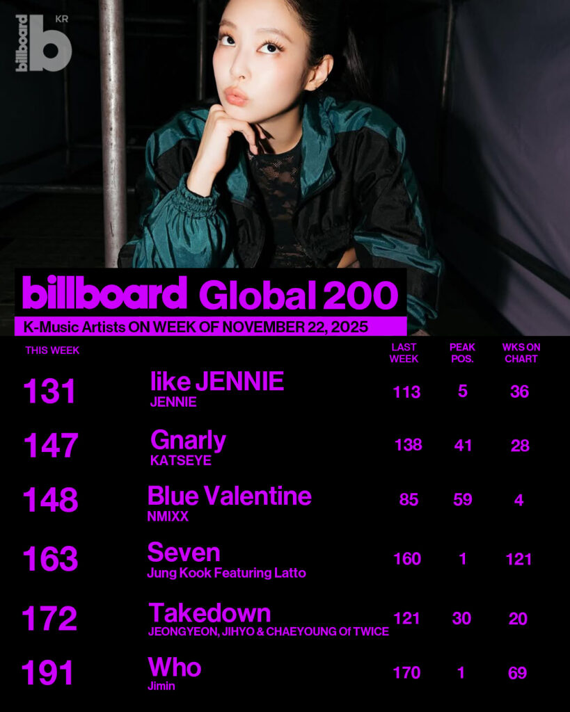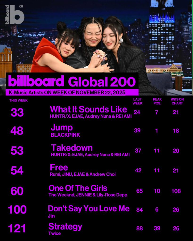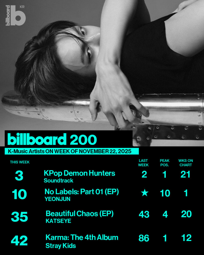 메인 앨범 200 차트에는 오랜만에 뉴페이스가 등장했다. 투모로우바이투게더 연준(YEONJUN)의 첫 솔로 EP ‘No Labels: Part 01’이 10위로 데뷔한 것. KATSEYE의 EP Beautiful Chaos는 이번 주 35위를 기록하며 장기 흥행을 이어가고 있고, Stray Kids의 정규 4집 Karma 역시 42위에 오르며 12주 연속 차트인에 성공했다. 11월 21일 발매예정인 새로운 앨범 DO IT 이 팀이 쌓아온 빌보드 200 차트 성적을 이어갈 수 있을지 기대를 모으고 있다. 글로벌 200 차트에서도 '케데헌'의 존재감이 도드라지는 가운데 2026 그래미 어워즈 주요 부문에 노미네이트된 로제의 “APT.”가 이번 주 글로벌 200 차트 23위에 오르며 저력을 입증했다. HOT 100 기록은 지난 9월 13일, 총 45주에서 멈췄지만 글로벌 200 차트에 55주 째 상위권을 유지 중인 “APT.”의 열기가 언제까지 이어질지 주목된다. 르세라핌과 j-hope의 강렬한 콜라보 “SPAGHETTI”는 단숨에 TOP10 진입에 이번주도 성공했다. 이번주 빌보드 차트 기록에 주목하길 !