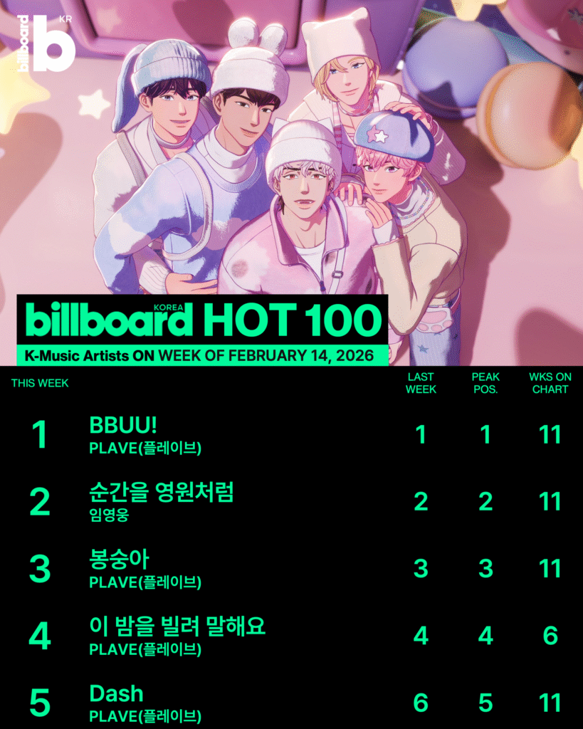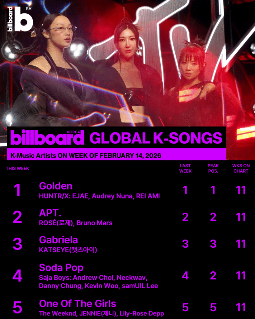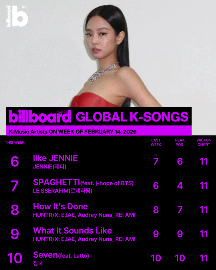 Billboard Korea Global K-Songs 차트는 지난주와 비슷한 흐름을 이어갔다. 최상위권의 순위가 대부분 유지되며 장기 흥행곡들의 저력을 확인할 수 있었다.
