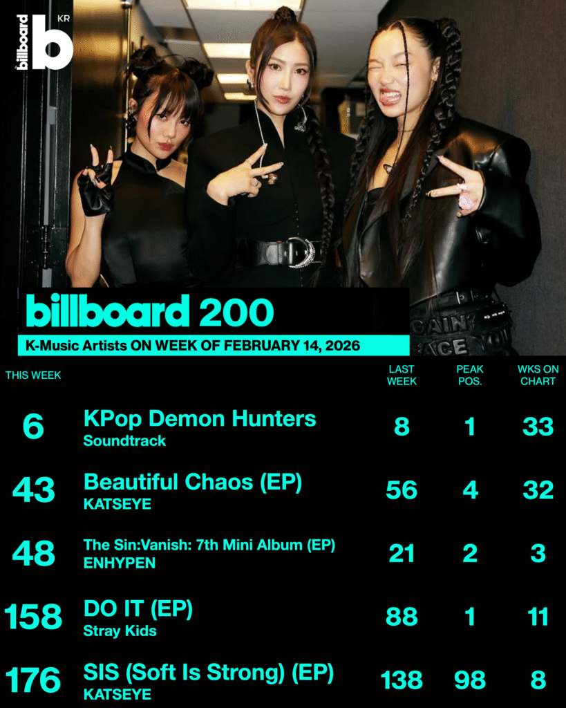 이번 주 Billboard 200 차트에서는 K-팝의 존재감이 다시 한번 확인됐다. 넷플릭스 ‘케이팝 데몬 헌터스’ 사운드트랙이 6위에 오른 가운데, 캣츠아이의 ‘Beautiful Chaos’는 56위, 엔하이픈의 ‘The Sin: Vanish’는 48위에 올랐다.