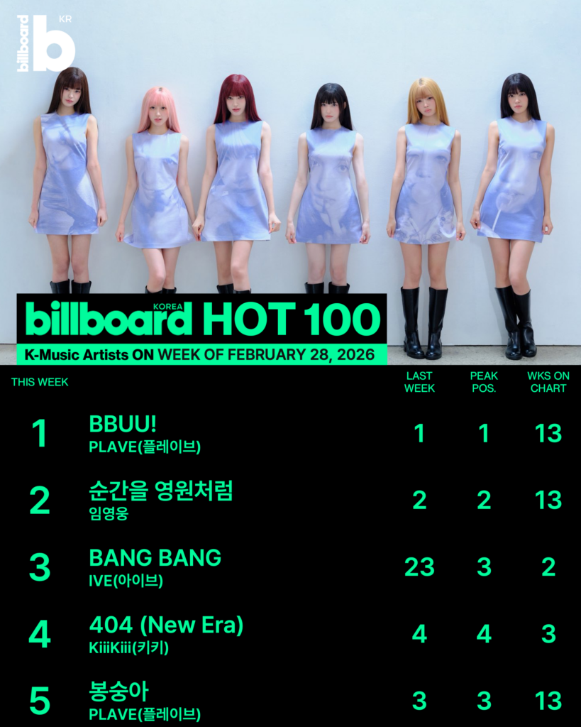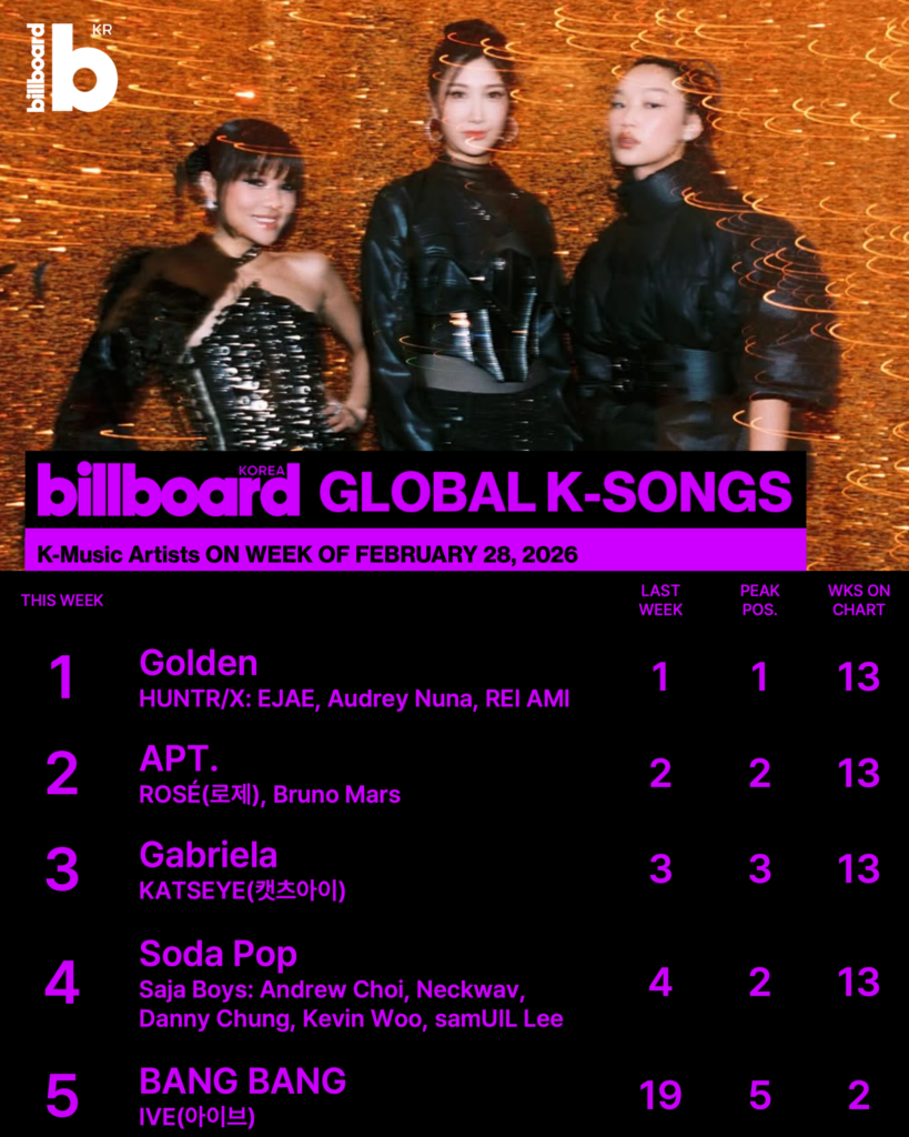 Billboard Korea Global K-Songs 차트에는 새로운 얼굴들이 등장했다. 아이브의 정규 2집 ‘REVIVE+’ 선공개곡 “BANG BANG”은 지난주 19위에서 이번 주 5위로 수직 상승했다.