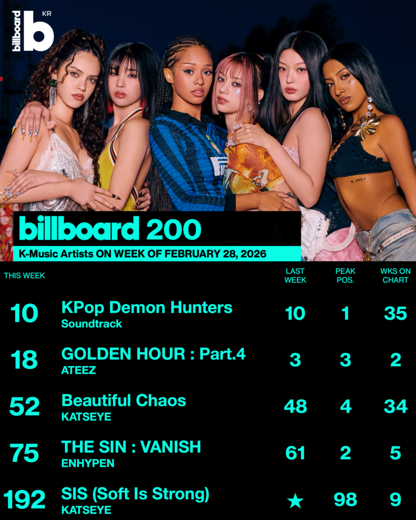 이번 주 Billboard 200 차트에는 다채로운 아티스트가 이름을 올렸다. 넷플릭스 ‘케이팝 데몬 헌터스’ 사운드트랙이 10위에 오른 가운데, 에이티즈의 ‘GOLDEN HOUR : Part.4’는 18위, 캣츠아이의 ‘Beautiful Chaos’는 52위, 엔하이픈의 ‘THE SIN : VANISH’는 75위에 올랐다.