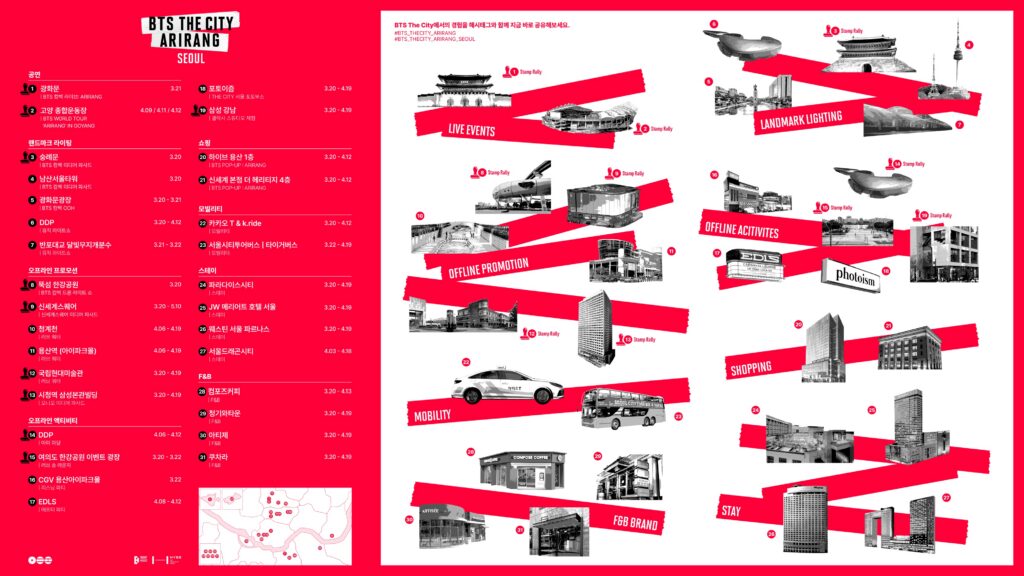 또한 서울 곳곳의 BTS 관련 장소를 방문하며 인증을 받는 ‘스탬프 랠리’도 진행된다. 팬들이 도시를 이동하며 BTS 테마 공간을 체험하도록 기획된 프로그램이다.