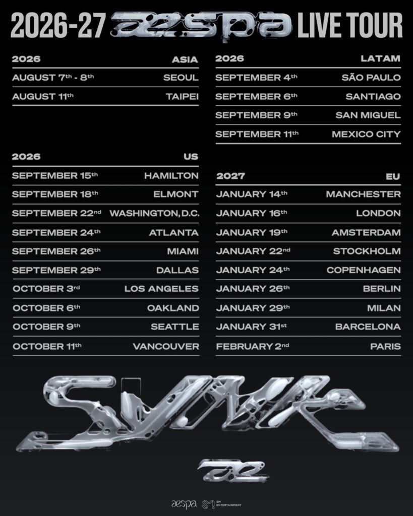 한편, 에스파는 매 앨범 독보적인 콘셉트와 강렬한 퍼포먼스로 글로벌 영향력을 넓혀온 만큼, 이번 새 월드투어를 통해 다시 한 번 세계 무대에서 존재감을 입증할 전망이다.