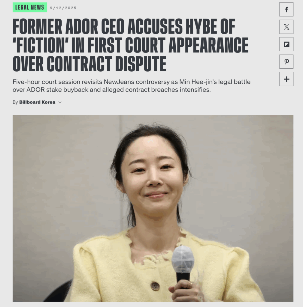 하이브와 장기간 법적 분쟁을 이어온 민희진 전 어도어 대표가 9월 11일 서울중앙지법 민사합의31부(재판장 남인수)에서 열린 변론기일에 직접 출석했다. 작년부터 이어진 갈등 속에서 민 전 대표가 법정에 모습을 드러낸 건 이번이 처음이다. 이날 하이브 측에서는 정진수 CLO(최고법률책임자)가 증인으로 출석했다. 이날 법정은 △하이브의 ‘주주간 계약 해지 확인’ 청구와 △민 전 대표의 ‘풋옵션(주식매수청구권) 대금 지급’ 청구를 병합 심리했다.