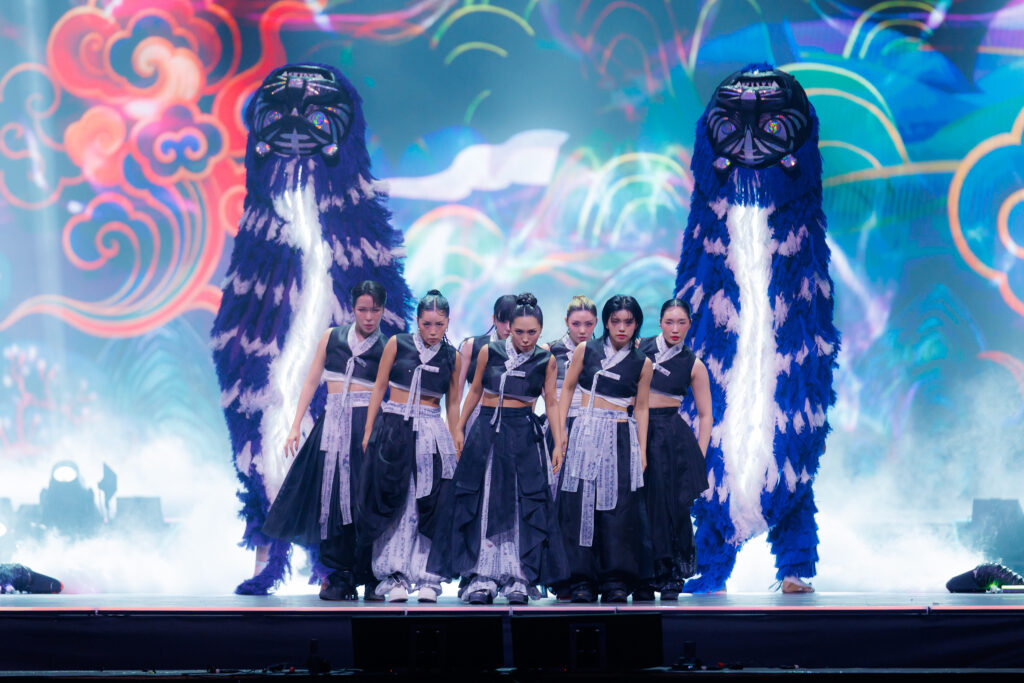 수묵화 속에서 현실로 소환된 '범접(허니제이, 효진초이, 리헤이, 노제, 리정, 아이키, 립제이)'의 퍼포먼스는 이번 MAMA의 슬로건인 'Hear My Roar, UH-HEUNG'의 주제 의식을 선명하게 전하며 챕터 원의 시작을 성공적으로 여는 데 일조했다. 은은하게 번져 나가는 묵처럼 다채로운 동선으로 움직이는 무브먼트를 비롯해 한국을 대표하는 가면극인 사자탈춤의 사자탈을 호랑이처럼 보이게 변형한 연출 역시 자연스럽게 동양의 미를 전했다. 특히 시상식 대부분의 무대가 '횡'으로 사용될 수 밖에 없는 가운데 사자탈을 쓴 댄서들이 일어서며 범접과 함께 움직이는 후반부 연출은 순간적으로 거대한 스타디움이 가득 찬 느낌이 들 정도로 압도적이었다.