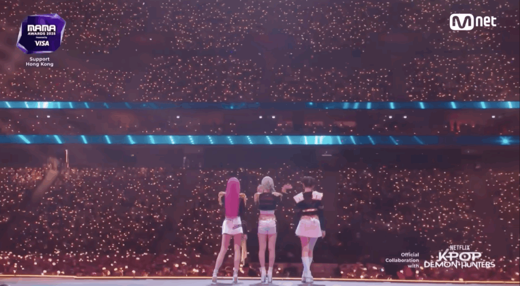 빌보드 차트에서 '이변'에 가까운 기록을 써내려가고 있는 '케이팝 데몬 헌터스(KPOP DEMON HUNTERS)'의 특별 무대가 올해 LA 케이콘에 이어, MAMA에서도 예고되었던 가운데, 이번에 헌트릭스(HUNTR/X)로 무대에 오른 것은 베이비몬스터(BABYMONSTER)였다. '미라'의 머리색처럼 염색한 파리타를 포함해 아현, 로라 세 명은 현실판 헌트릭스가 되어 무대를 채웠다. 흥미로운 점은 가상의 K-팝 걸그룹에게 주어진, 관념적인 K-팝 공식을 활용해 탄생한 곡인 "Golden"을 부를 때 멤버들의 기량이 한층 발휘된 것처럼 느껴졌다는 점이다. 어떤 면에서는 전날 본인들의 무대보다 더욱 편안하고 자연스럽게 느껴질 정도로 말이다. 배우 안효섭과 아덴 조, 메기강 감독과 공동 연출자 크리스 아펠한스 등 '케데헌' 관계자들이 시상자와 수상자로 함께한 가운데 노란색 불빛이 퍼져나갔다. 애니메이션 속 장면처럼 무대에 선 베이비몬스터 멤버들의 뒷모습과 관객석을 비추는 화면 연출까지, 베이비몬스터의 이번 영상은 12월 3일 현재 유튜브 조회수 700만회를 기록하며 이번 MAMA 무대 중 가장 높은 수치를 기록하고 있다.