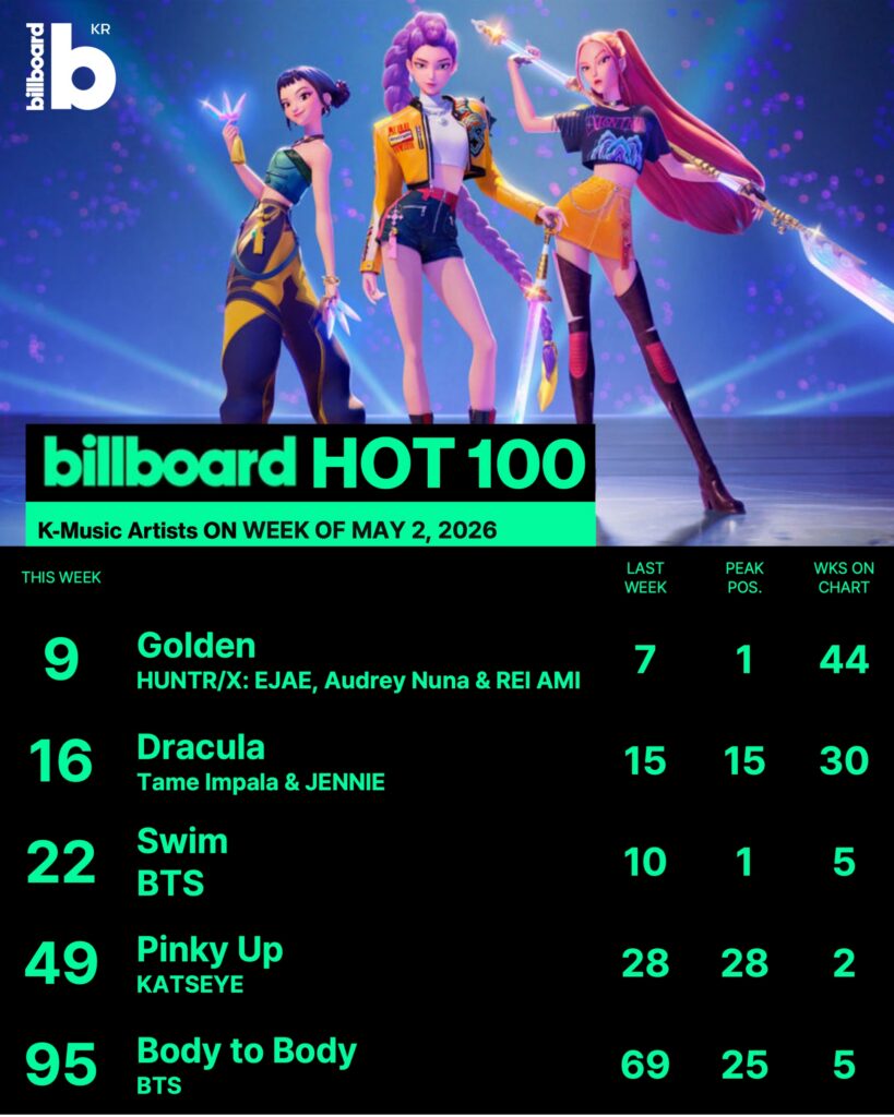 헌트릭스(HUNTR/X)의 “Golden”은 9위를 기록하며 44주 연속 차트인이라는 장기 흥행을 이어갔고, 테임 임팔라(Tame Impala)와 제니(JENNIE)가 협업한 “Dracula”는 16위로 소폭 상승하며 글로벌 협업의 존재감을 보여줬다.