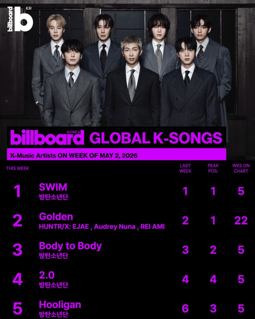 2026년 5월 2일 자 Billboard HOT 100 차트에서는 다양한 K-뮤직 아티스트들이 이름을 올린 가운데, BTS는 이번 주에도 멀티 트랙 진입으로 존재감을 드러냈다.