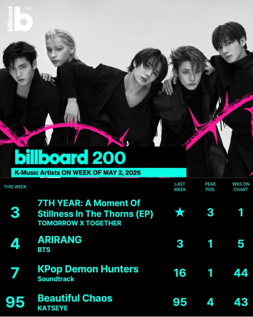 투모로우바이투게더(TOMORROW X TOGETHER)의 미니 앨범 ‘7TH YEAR: A Moment Of Stillness In The Thorns (EP)’는 3위로 첫 진입하며 강력한 데뷔 성과를 기록했다.