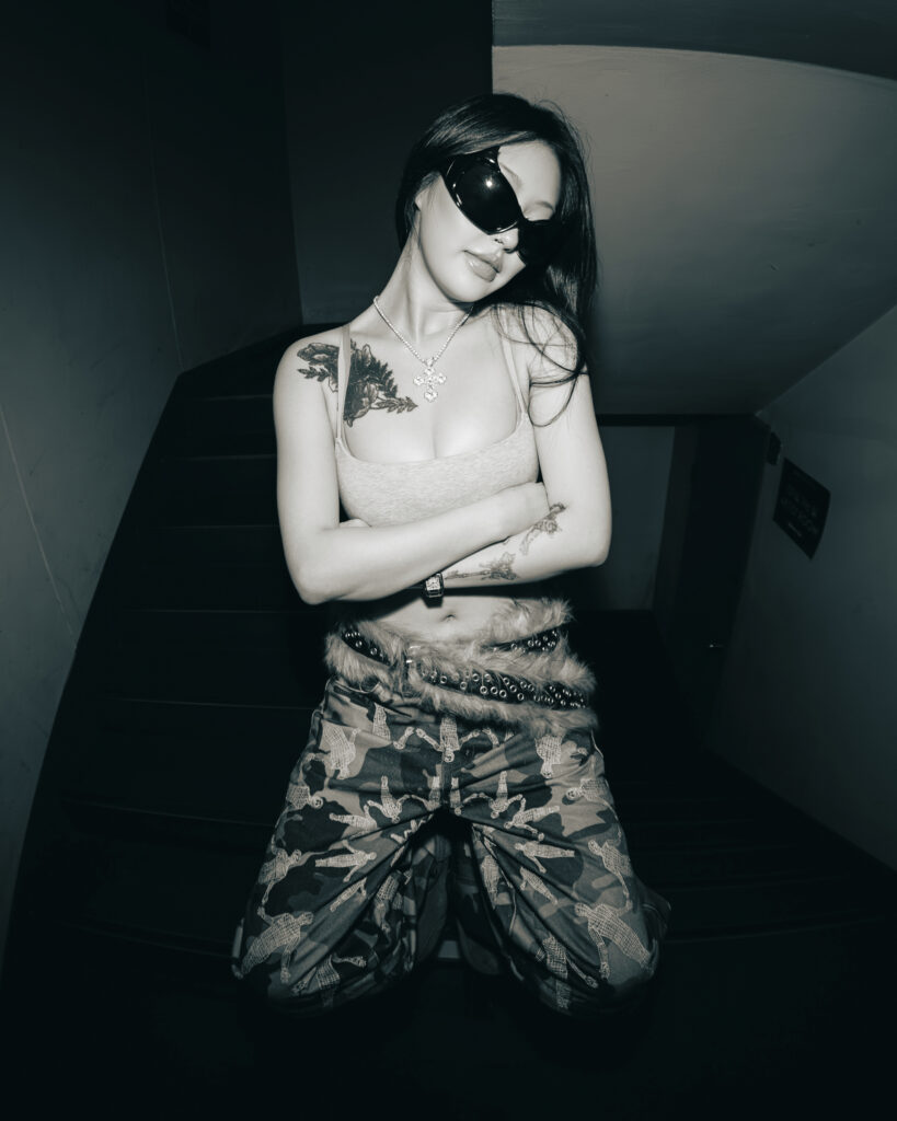 프리키데이를 의식한 걸까? 선글라스까지 완전 프리키하게 갖춰 쓰고 등장한 트랩퀸 카모! 이름에 걸맞게 카모플라주 배기 팬츠로 스타일을 완성하며 자기 브랜딩에 충실한 모습을 보였다. “요즘은 소소카모 음악을 자주 듣는다”는 말에서 엿보이듯, 라임에 진심인 래퍼다운 면모까지! 그녀가 등장하자 여성 팬들의 환호가 유독 뜨거웠다는 후일담과 함께, 카모의 쿨한 인터뷰를 전한다.