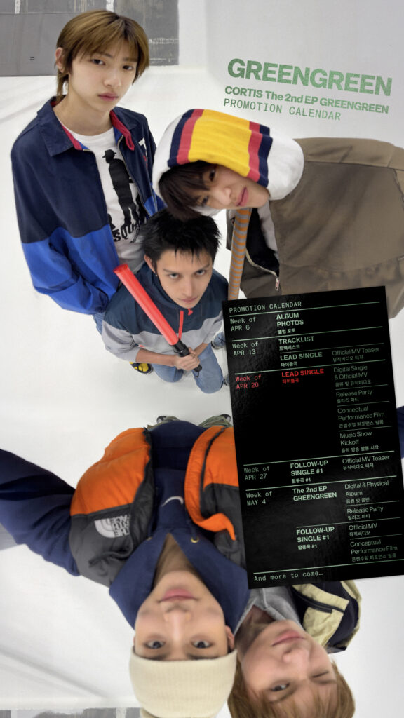 코르티스가 지난 26일 오후 9시 공식 SNS를 통해 미니 2집 ‘GREENGREEN’의 프로모션 캘린더를 공개했다. 이에 따르면 코르티스는 오는 4월 20일 타이틀곡 음원을 발매하고 본격적인 활동에 나선다. 타이틀곡 뮤직비디오와 함께 안무에 집중한 컨셉추얼 퍼포먼스 필름도 순차적으로 공개될 예정이다.