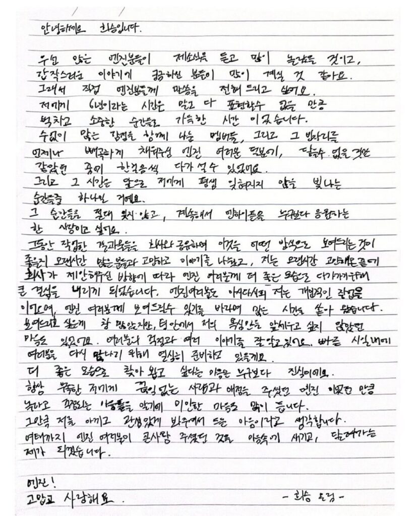 희승 역시 팬 플랫폼을 통해 직접 심경을 전했다. 그는 손편지를 통해 “수없이 많은 감정을 함께 나눈 멤버들과 엔진 덕분에 닿을 수 없을 것 같던 꿈에 한 걸음씩 다가설 수 있었다”며 팬들에게 감사의 마음을 전했다. 이어 “빠른 시일 내 여러분을 다시 만나기 위해 앨범을 준비하고 있다”고 밝히며 솔로 활동을 예고했다.